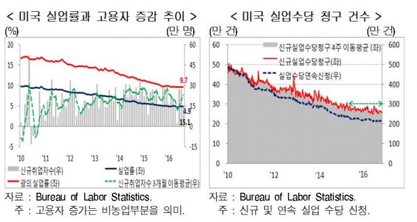 2016년 8월 미국의 실업률은 4.9%로 자연실업률 4.8%수준에 근접했고 선행지표인 신규실업수당청구 건수도 80주 연속으로 30만 건을 하회하는 등 양호한 모습을 보였다. 이로 인해 시간당 임금 상승률은 2015년 이후 상승세로 전환됐고, 가처분 소득 대비 총 부채 비율이 낮아지면서 가계 건전성이 개선되고 있다. 또한 개인소득 증가율이 소비지출 증가율을 상회하고 있어 소비여력이 증가하고 있다. 지난 7월 미국의 소비자 신뢰지수도 101.1p로 연중 최고치를 기록했다.