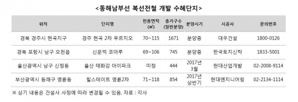이러한 영남권 대형 교통 호재에 수혜 지역의 아파트 분양도 주목받고 있다. 2018년 개통이 완료될 예정이어서 입주 시기에 개통되는 단지의 경우 입주와 함께 이용도 기대해 볼 수 있다.