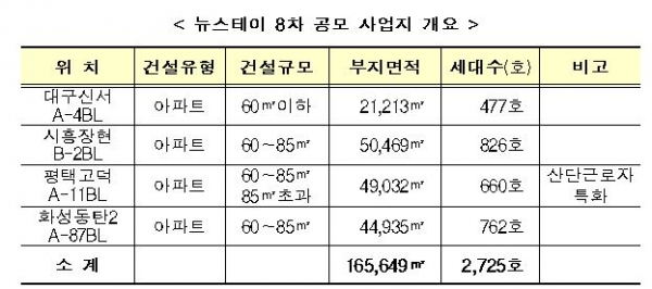 국토교통부, 한국토지주택공사(LH), 주택도시보증공사(HUG)는 대구신서, 시흥장현, 평택고덕, 화성동탄2 등 4개 지구, 2,725호에 대한 뉴스테이 LH 8차 공모를 실시한다고 10일 밝혔다.