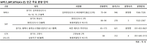 대표적인 광역교통망 호재로는 GTX(수도권광역급행철도)와 광역급행버스(Metropolitan Bus‧M버스) 등이 있다. 이미 지난해 말 개통을 완료한 SRT(수서발 고속열차)도 이에 해당한다. 이들은 수도권 주요 거점 지역을 중간 정차 없이 이동하기 때문에 기존 교통망에 비해 이동 시간이 크게 단축된다.