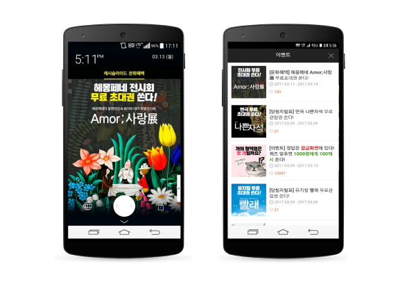참여방법은 캐시슬라이드 잠금화면에서 관련 이벤트를 통해 신청이유와 공연에 대한 기대평을 남기면된다. 상품은 무료 또는 할인티켓이다. 오는 14일까지 프랑스 유명 일러스트화가 헤몽페네 ▲Amor-사랑 전(展) 티켓증정 이벤트가 진행될 예정이다. 또한 대학로 인기작 연극 그녀를 믿지 마세요, 텐: 열흘간의 비밀 티켓증정 이벤트도 진행된다.