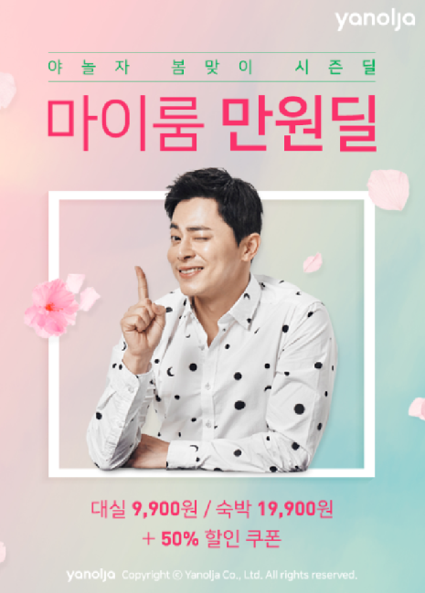 야놀자는 봄철을 맞아 3월 한 달간 '마이룸 만원딜' 이벤트를 진행한다. 매주 수요일 야놀자 앱을 통해 프리미엄 객실 ‘마이룸’을 이용할 경우 대실과 숙박을 각각 9900원과 19900원의 할인된 가격으로 이용할 수 있는 이벤트다. 예약자를 대상으로 동일숙소 재방문 시 일반 객실을 50% 할인해주는 ‘단골 반값 할인 쿠폰’ 이벤트도 함께 진행한다.