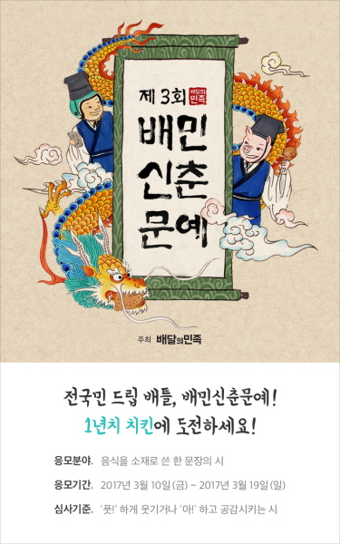 배달앱 ‘배달의민족’은 매년 봄 ‘배민신춘문예’를 개최한다. 올해로 3회째를 맞는 배민신춘문예는 배달의민족이 주최하는 음식 주제 창작시 공모전이다. 총상금은 치킨 500여 마리다.