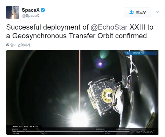 이날 발사된 스페이스X의 팰컨 9 로켓은 상업용 통신위성 '에코스타 23'을 탑재했습니다. 스페이스X가 쏘아 올린 인공위성은 지구에서 3만5000㎞ 떨어진 상공의 궤도를 돌며 서경 45도 상에서 브라질에 통신 및 위성 TV 서비스를 제공하는 임무를 수행하게 됩니다.