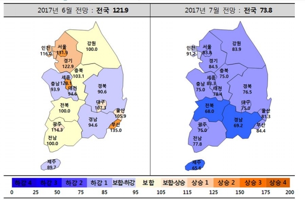 수도권과 부산, 세종, 울산, 강원 등 지역만 80선을 상회하고 그 외 모든 지역이 60~70선을 보이면서 주택공급시장 분위기가 6월에 비해 크게 위축될 것으로 전망됐다. 7월 HBSI 전망치가 기준치(100)을 넘는 지역은 단 한 곳도 없고, 2~3개월 기준선을 상회하면서 전국 공급시장을 견인한 서울·세종 조차도 80선으로 크게 하락했다.