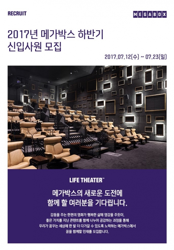 멀티플렉스 영화관 메가박스가 2017년 하반기 신입사원 공개 채용을 실시한다.