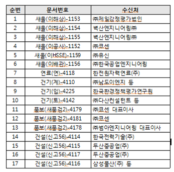 정유섭 의원실이 한수원 측으로부터 받은 자료에 따르면 이번 신고리 5,6호기 공사 중단으로 ‘계약 일시 중단’ 공문을 받은 업체는 총 17개다. 한국전력기술, 한전원자력연료 등 한전 관계사를 포함해 벽산엔지니어링, 코센, 두산중공업, 삼성물산 등 원전 시공 및 기자재 공급을 담당하는 기업들이다.