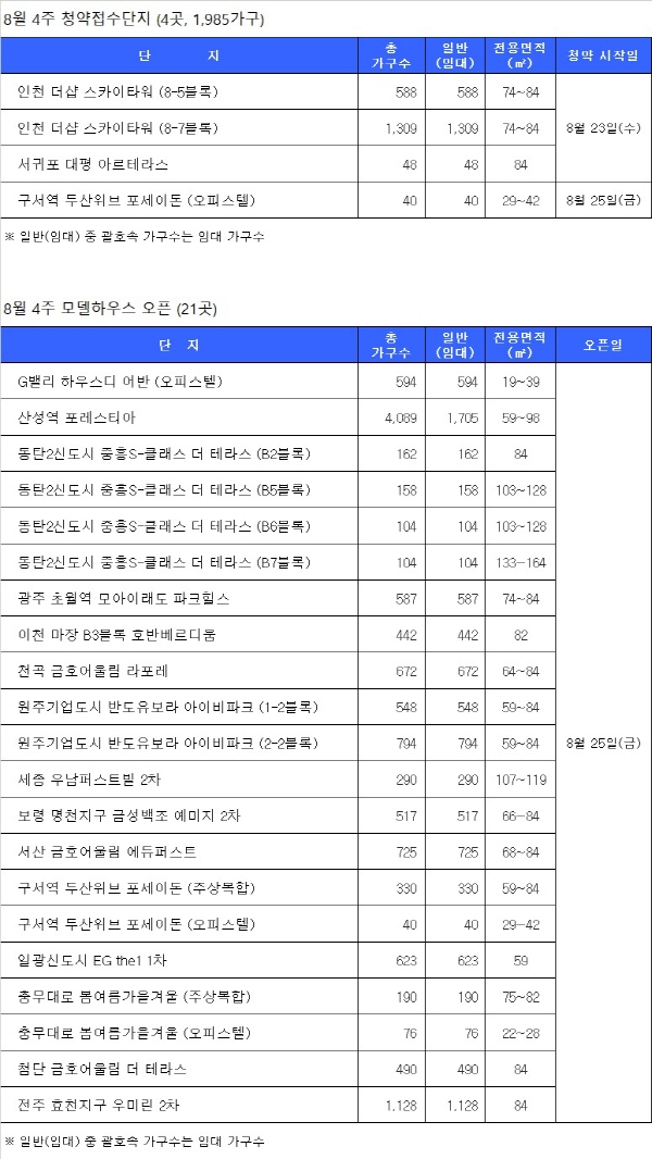 닥터아파트에 따르면, 8월 넷째 주 청약물량은 4곳 1985가구다. 모델하우스 오픈이 지난주보다 크게 늘어났다. 총 21곳의 견본주택이 문을 열 예정으로 있다. 당첨자 발표는 9곳, 당첨자 계약은 4곳이다. 부동산 리서치회사 닥터아파트가 8월 넷째주(21일~26일) 분양일정을 정리했다.