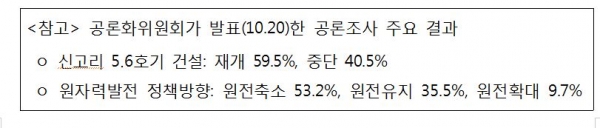 앞서 공론화위원회의는 지난 20일 신고리 5·6호기 건설 재개, 원자력발전 비중 축소방향의 에너지정책 추진, 신고리 5‧6호기 건설 재개에 따른 보완조치를 권고했다.