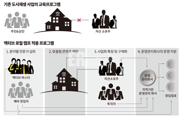 국토연구원 산하기관인 건축도시공간연구소의 윤주선 박사는 이에 대해 “효용이 없는 일”이라고 비판했다. 이런 맥락에서 윤 박사가 일본 도시재생 프로그램 ‘베링스쿨’을 벤치마킹한 것은 주목할 필요가 있다. 민간이 책임지고 기획 단계부터 도맡아 지역을 활성화하는 국내형 모델을 만들기 위해 시작한 ‘액티브로컬’ 프로젝트가 그것이다.