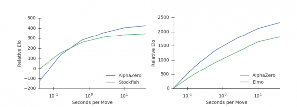 또 알파제로는 탐구하는 시간도 다른 인공지능보다 뛰어나다. 알파제로는 인간이 생각을 오래 할수록 훌륭한 아이디어를 떠올리듯이 다음 수를 분석할 때 시간을 많이 사용할수록 결과물의 질도 향상되는 것으로 파악됐다. 알파제로가 10초를 분석하면 체스 소프트웨어 스톡피쉬보다 100배 우수한 성능을, 쇼기 소프트웨어 엘모와는 약 75배 우수한 결과물을 얻었다.