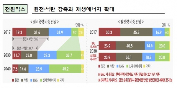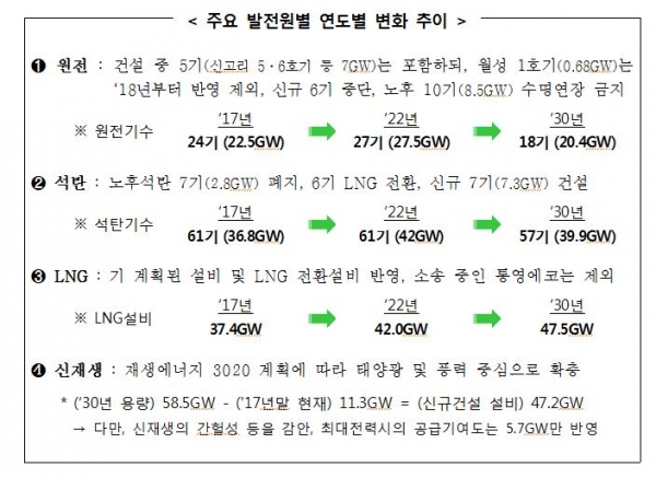 이번 계획에 따르면, 정부는 전체 발전에서 원자력이 차지하는 비중을 현재 30.3%서 오는 2030년 23.9%로 낮추고 신재생 비중을 6.2%에서 3배 이상 많은 20%로 높이며, 석탄화력발전은 45.3%에서 36.1%로 낮추기로 했다.