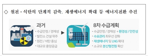 산업부는 “기존 수급계획이 수급안정과 경제성 위주로 수립된 것에 반해 8차 계획은 환경성·안전성을 대폭 보강해 수립한 게 특징”이라면서 “발전소 건설을 우선 추진하기보다는 수요관리를 통한 합리적 목표수요 설정에 주안점을 뒀고 신규 발전설비는 대규모 원전·석탄 일변도에서 벗어나 친환경·분산형 재생에너지와 LNG 발전을 우선했다”고 설명했다.