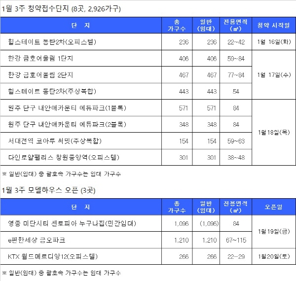 1월 셋째 주 청약물량은 8곳 2926가구다. 모델하우스는 3곳 오픈예정이다. 당첨자 발표는 16곳, 당첨자 계약은 8곳이다. 부동산 리서치회사 닥터아파트가 1월 셋째주(1월 15일~1월 20일) 분양일정을 정리했다.