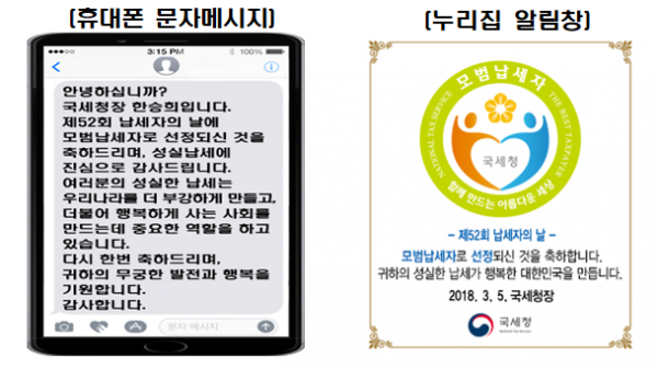 국세청은 또 국세청 누리집과 SNS 등을 통해 성실납세 하는 부모, 친구, 이웃 등에게 ‘감사메시지 남기기’ 행사를 벌인다. 응모 기간은 5일~14일이다. 전산 추첨으로 참여자에게 모바일 상품권을 준다.