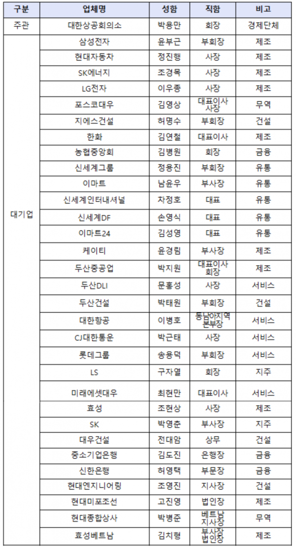 베트남측에선 부 띠엔 록 베트남상의 회장, 당 황 안 베트남 전력공사 사장, 응웬 부 쯔엉 선 베트남 석유공사 사장, 당 타잉 하이 석탄광물공사 사장, 즈엉 티 마이 화 빈그룹 사장, 찡 반 꾸엣 FLC그룹 사장, 즈엉 지 타잉 베트남항공 사장 등이 참석한다.