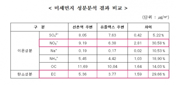 연구진은 신촌역과 유플렉스의 대기오염이동측정차에서 이동형 성분측정기기를 활용해 미세먼지 성분농도를 비교 측정했다. 측정 결과 경유차에서 주로 발생되는 미세먼지(PM2.5) 성분인 질산염(NO3-)과 원소탄소(EC)는 유플렉스 주변이 신촌역에 비해 29.6%, 30.6% 낮게 분석됐다.