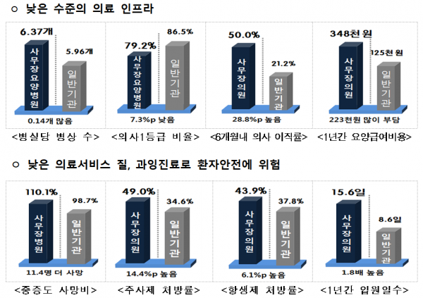 보건복지부는 “사무장병원을 근절하기 위해 지속해서 제도 개선을 추진하고 단속과 적발을 강화해왔다”면서 “그럼에도 사무장병원 적발건수는 여전히 증가하는 추세이며 적발된 병원에 대한 부당이득환수율도 낮은 상황이다”고 설명했다. 환수율 평균은 7.2%다.