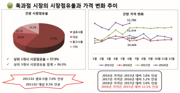 독과점시장은 시장 참여자가 많은 쟁시장에 비해 가격 인상폭이 크다는 특징을 보인다. 가격 담합이 용이하기 때문이다. 간장의 경우 2016년 전년에 비해 3.8% 올랐고 이어 5.2%, 3.0% 각각 인상됐다. 3년 사이 무려 12.5%나 상승한 것이다.