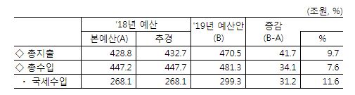 내년 총수입은 481조3000억원으로 올해보다 7.6% 늘어난다. 국세수입은 반도체·금융 업종 등 법인의 실적 개선, 법인세율 인상 등으로 11.6% 증가할 것으로 정부는 전망했다.