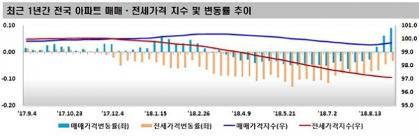 지방 아파트값이 하락세를 벗어나지 못하고 있지만 서울을 비롯해 인천, 경기등 수도권 집값이 오르면서 전국 주간 아파트 매매가격 역시 지난주 대비 상승폭이 확대돼 0.09%를 나타냈다.