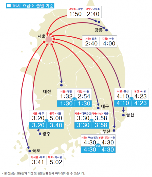 이날 오후 4시 요금소 출발을 기준으로 대도시 간 예상 최대 소요시간은 대전-서울 2시간54분, 부산-서울 4시간30분, 광주-서울 5시간, 목포-서서울 5시간2분, 강릉-서울 4시간, 양양-남양주 2시간40분으로 전망된다.