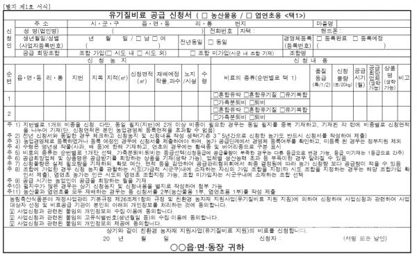 유기질비료 지원 희망 농업경영체는 비료종류·공급시기·공급업체·공급물량 등을 신청서에 기재해 농지소재지 읍·면·동사무소에 제출하면 된다. 귀농 등으로 이번 사업신청 시기에 농업경영체로 등록되지 않은 경우라도, 내년도 농협의 비료 공급시기까지 농업경영체로 등록될 수 있다면 신청 가능하다.