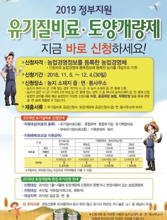 김수일 농식품부 농기자재정책팀장은 “내년도 친환경유기질비료와 토양개량제 지원을 원하는 농업인은 본인의 농업경영정보를 등록하거나, 기존의 등록된 농업경영정보를 갱신해 사업을 신청해야 한다”고 밝혔다.