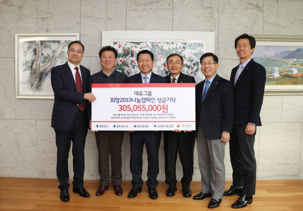 [이코노믹리뷰=박자연 기자] 대유그룹이 지난 17일 ‘희망 2019 나눔캠페인’ 전달식을 통해 기부금 3억505만5000원을 전달했다고 18일 밝혔다.