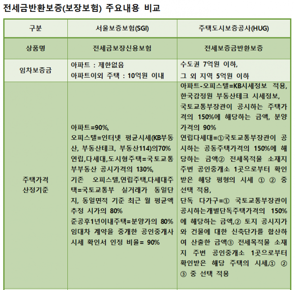 [이코노믹리뷰=진종식 기자] 안전한 전세보증금 반환보증 목적으로 가입하는 ‘전세금반환보장보험’ 요율이 서울 보증보험과 주택도시보증공사 상품간에 최대 50% 차이를 보여 전세입자들의 불만인 높아지고 있다. 이런 가운데 서울 보증보험은 최근 가입요건 마저 대폭 강화하면서 자체 수익성 개선 시도보다는 고객에게 모두 전가하고 있다는 비난이 일고 있다.