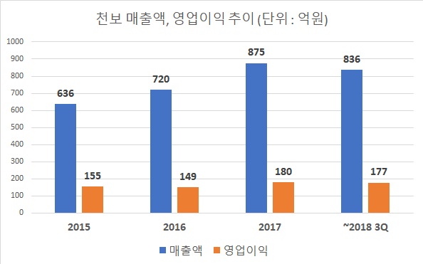 천보의 주력산업인 디스플레이 소재산업 매출이 대체로 성장 둔화세를 보이고 있기 때문이다. 천보의 디스플레이 매출액은 지난 2016년과 2017년 모두 약 378억원으로 비슷한 수준이었다. 지난해 3분기 매출액은 330억원이다. 천보 매출액 중 디스플레이 분야가 차지하는 비중은 50% 내외다.