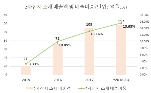 실제 천보의 2차전지 소재 분야 매출은 2015년 21억원에서 2017년 109억원으로 5배 이상 뛰었다. 매출비중 역시 3.33%에서 지난해 3분기 기준 15.65%으로 상승했다. 업계에 따르면, 올해 2차전지 매출 비중은 더욱 늘어날 것으로 파악된다.