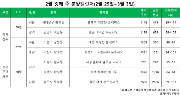 [이코노믹리뷰=김진후 기자] 부동산 전문 리서치업체 리얼투데이에 따르면 2월 넷째 주는 전국 4곳에서 총 3159가구의 1순위 청약접수가 이뤄진다. 이는 오피스텔과 임대주택을 포함하되 도시형생활주택과 행복주택을 제외한 수치다. 이밖에 당첨자 발표는 3곳, 계약은 8곳에서 진행된다. 견본주택은 전국 3곳에서 개관한다.