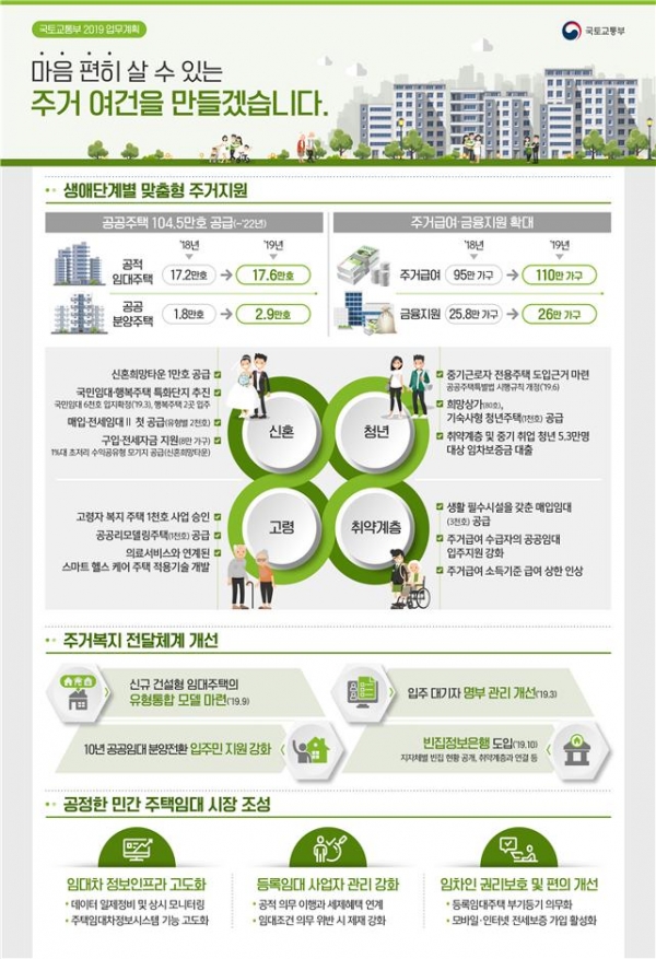 주택도시실은 2019년 공공주택 총 20만5000가구를 공급하고, 수요자 맞춤형 시설·서비스를 확대한다. 또한 주거급여를 상향하고 생애주기별 주거복지 본격화, 비주택 등 주거취약계층을 집중 지원할 계획이다. 맞춤형 지원에는 신혼희망타운 신규유형, 청년 기숙사형 임대주택 등이 포함됐다.