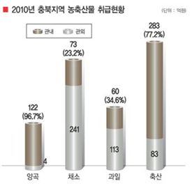충북지역 농산물 취급 현황을 보면 충북유통이 지역 농축산물 판매에 얼마나 열심인지 나타난다. <도표>를 보면 양곡은 96.7%, 채소 23.2%, 과일 34.6%, 축산 77.2%의 수치가 기록된다. 지역 내에서 생산되지 않는 채소나 과일이 많다는 것을 감안할 때 지역내 농축산물 취급도가 매우 높다는 것을 알 수 있다. 특히 도표의 기준이 된 지난 2010의 충북유통 농축산물 총 취급액 979억원 중 관내 농축산물 비중이 538억원으로 55%에 달한다.