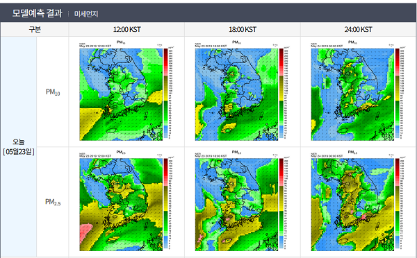 전국 대부분의 미세먼지 농도는 '나쁨'이다. 다만, 강원영동 지역과 제주도는 '보통'이다. WHO 권고 기준으로는 강원 영동을 제외한 전국이 '매우 나쁨'이고, 강원영동 지역과 제주도만 '한때 나쁨' 수준을 보이겠다.