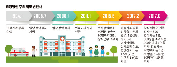 요양병원은 2014년에 발생한 장성요양병원 화재사건으로 시설안전 현황과 간병 인력부재 문제가 더욱 확대되기도 했다. 이에 정부는 요양병원의 시설기준을 강화하고 당직의료인을 증원하도록 했다. 2017년 정부는 요양병원의 당직 의사는 300명까지 1명, 300명을 초과할 때마다 1명을 추가하도록 정했고 간호사는 80명까지 1명, 80명 초과하는 인원수마다 1명을 더 추가토록 했다.
