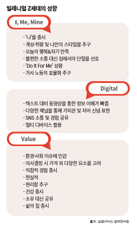 신장훈 삼정KPMG 유통·소비재산업 부대표는 “지구 온난화와 기후변화, 환경오염과 미세먼지 심화 등을 일상 생활 속에서 체감하는 밀레니얼과 Z세대는 환경 이슈에 민감하다”면서 “또 정의와 올바름에 대해서도 깊이 생각하고, 기업의 상품을 살때도 기업의 진정성, 진실성, 도덕성을 구매 기준 중 하나로 여기는 일명 의식 있는 컨셔스(Conscious)소비 성향을 강하게 보인다”고 말했다.