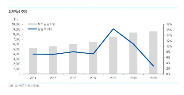 노동계나 기업계처럼 직접적 이해관계 당사자들이 아닌 다른 관점에서도 이번 최저임금 인상안에 대해서는 이견들이 많다. 유안타증권 이진협 연구원은 12일자 최저임금 인상에 대한 리포트에서 “2020년의 최저임금은 오프라인 유통업체들의 인건비 부담은 상당부분 덜어줄 수 있을 것으로 전망한다”면서 “특히 최저임금 근로자 비중이 높은 편의점과 할인점의 인건비 부담 완화가 예상된다”라면서 부진한 실적으로 한껏 위축된 오프라인 유통업계의 인건비 부담이 줄어드는 것을 긍정적으로 해석했다.