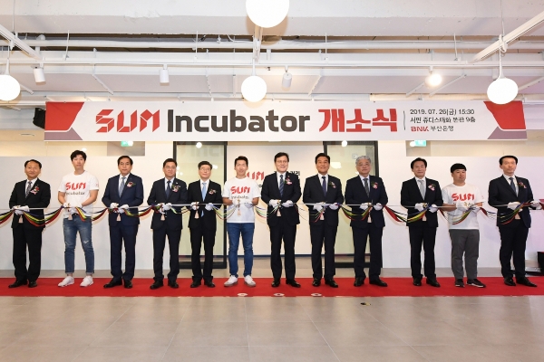 또한 성장단계별 맞춤형 코칭, 각 분야 전문가와의 1:1 매칭 멘토링, 다양한 교육 및 커뮤니티를 통한 교류의 장을 마련하는 등 엑셀러레이팅 프로그램을 운영할 계획이며 세무회계, 가업승계, 법인전환 등 체계적인 경영컨설팅도 제공한다. 이날 개소식에는 최종구 금융위원장을 비롯해 조종래 부산지방중소벤처기업청장, 김지완 BNK금융그룹 회장 등이 참석해 ‘SUM Incubator’의 개소를 축하하고, 혁신성장의 주역으로 성장할 창업기업들을 격려했다.