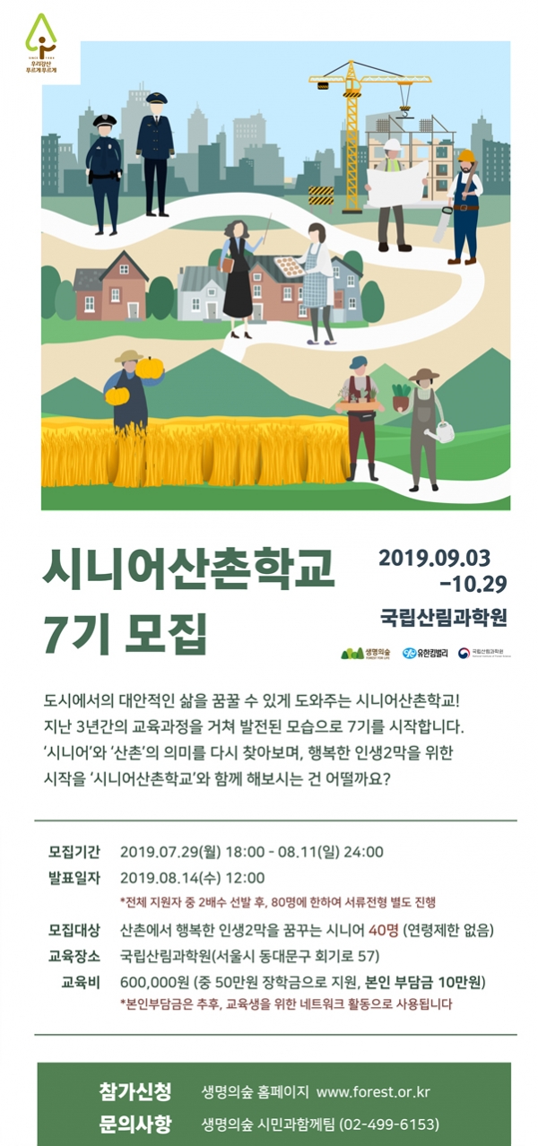 참가 희망자는 8월 11일(일)까지 생명의숲 홈페이지를 통해 지원할 수 있으며, 참가자 발표는 8월 14일(수) 예정돼 있다. 7기 시니어산촌학교의 모집 인원은 총40명이며 유한킴벌리 우리강산 푸르게 푸르게 기금후원과 국립산림과학원의 협력으로 운영된다.