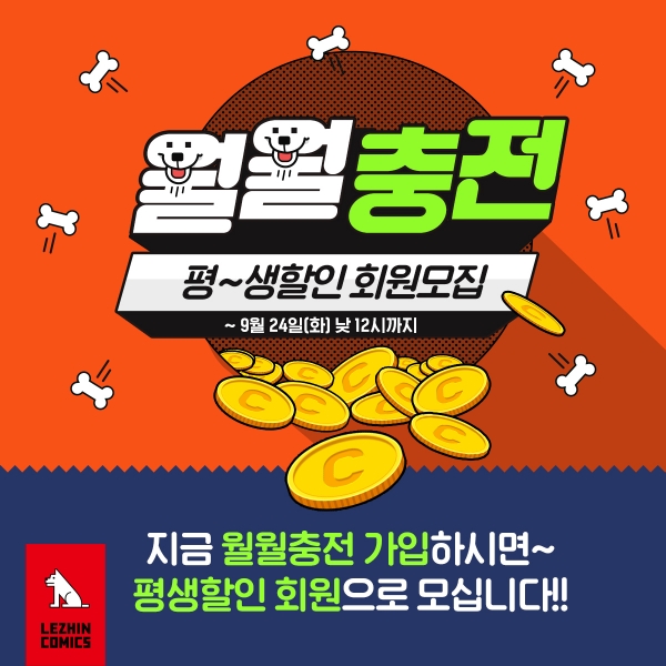 레진코믹스는 정기결제 서비스 론칭 기념으로 월월충전 평생할인 특가 이벤트도 진행한다. 9월 24일 낮 12시까지 월월충전에 가입하는 모든 고객은 다양한 오픈 특가 상품 가운데 본인이 원하는 것으로 평생 할인 혜택을 받을 수 있다. 60코인에 1만원인 일반결제 상품이 월월충전에서는 70코인에 1만원이지만, 오픈 특가에서는 70코인에 8500원으로 평생 혜택이 제공된다.