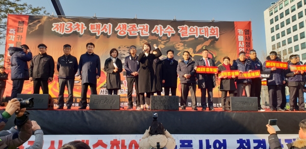 택시업계는 여당 인사를 향해서는 날 선 비판을 멈추지 않는 한편 야당 인사에게는 환호를 보냈다. 실제로 전현희 민주당 의원이 등장하자 택시업계의 야유가 상당했다. 전 의원이 마이크를 잡자 택시기사들은 일제히 야유를 하며 격렬하게 비난했다. 전 의원은 “여러분과 함께 고민하겠다”면서 “상생의 길을 찾을 것”이라고 말했으나 흥분한 택시기사들은 연단 아래까지 몰려와 강하게 반발했다. 이 과정에서 물병이 날아드는 등 소란이 벌어지기도 했다.