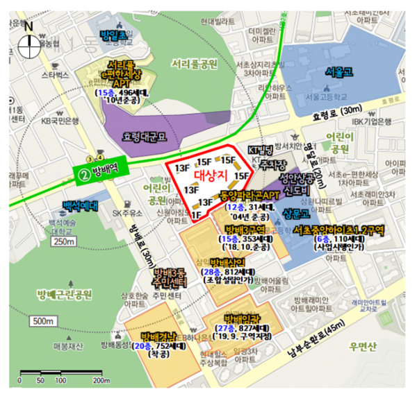 방배신동아아파트는 서울시 서초구 방배동 988-1번지 일대에 위치해 있는 1982년 준공된 노후아파트로 기존 세대수는 493가구다. 면적은 3만7902.6㎡ 규모로, 용도지역은 제3종 일반주거지역이다.