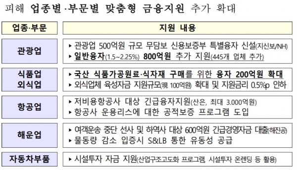 아울러 대책에서는 소상공인과 중소기업에 특화된 특별금융지원도 대폭 확대하겠다는 의지도 드러났다. 정부는 현장 수요가 많은 소상공인 대상의 1%대 초저금리 대출 공급을 전례없이 현재 1조2000억원 규모에서 2조원으로 확대해 3조2000억원을 공급할 것을 약속했다. 또 연매출 6000억원 이하의 영세한 개인사업자에 대해 부가가치세를 간이과세자 수준으로 경감하고, 숙박업 등 피해업체의 재산세와 종합부동산세 등은 지방의회의 의결을 거쳐 감면 받을 수 있도록 적극 지원하겠다고도 밝혔다.