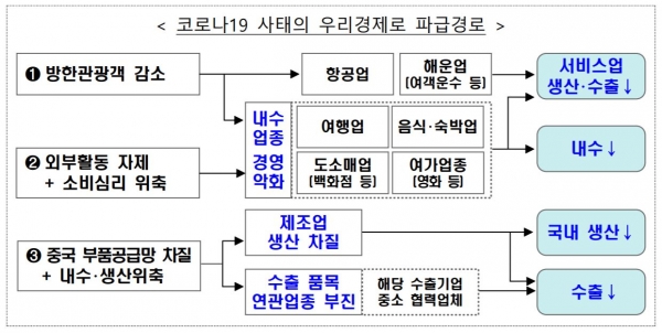 민생 경제 영역에서 이번 정부 대책의 가장 큰 줄기는 소상공인 지원과 내수 부양이다. 홍 부총리는 “국민 안전을 최우선으로 한 방역지원과 함께 그동안 1단계 긴급대응으로 세정, 금융, 부품수급, 중소기업과 소상공인, 관광과 항공 ·해운, 지역경제, 수출 등 업종별 ·분야별 긴급대책을 순차적으로 발표해 총 4조원 규모의 대책을 시행해 오고 있다”라면서 “2단계 대응으로는 기존 4조원 대책과 오늘 발표할 16조원 규모의 민생 경제 종합대책까지 포함하면 총 20조원 규모에 이르는 대규모 총력지원정책 패키지를 통해 이번 사태로 인한 피해극복 지원과 경제활력 보강을 최대한 뒷받침해 나가고자 한다”라고 말했다.