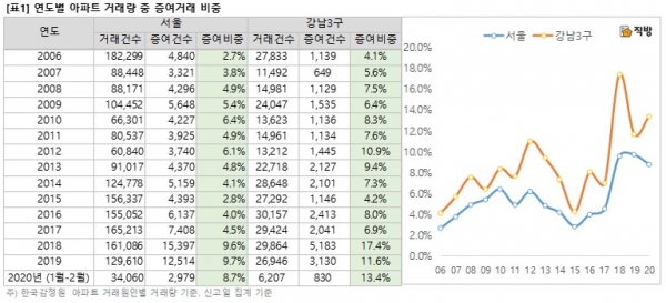 실제 서울지역 아파트 거래량 중 거래원인이 증여인 거래량은 2017년 7408건에서 2018년 1만5397건으로 2배 이상 급증한데 이어 지난해에도 1만2514건을 기록했다. 2018년 이전에는 전체 거래에서 2~4% 내외를 차지하던 증여의 비율이 지난해에는 9.7%까지 증가한 것이다.
