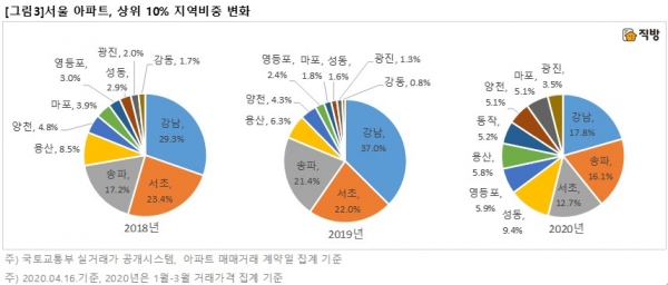 직방이 지난해와 올해 3월까지의 거래량을 통해 서울아파트 실거래 자료를 분석한 결과, 15억 원을 넘는 아파트의 거래 비중이 서초구는 16.3%포인트(53.8%→37.5%), 용산구는 9.4%포인트(32.9%→23.5%) 감소했다. 강남구와(8.0%포인트 하락)과 송파구(5.8%포인트 하락) 역시 기타 자치구보다 하락세가 두드러졌다.