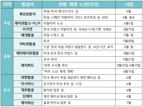 독일 국적의 루프트한자는 미국 로스앤젤레스·캐나다 토론토·인도 뭄바이 등을 잇는 노선의 운항을 이달부터 재개한다고 발표한 데 이어, 중순에는 독일 프랑크푸르트에서 스페인 이비자와 말라가·이탈리아 베네치아·그리스 크레타와 로도스·포르투갈 파로·스페인령 지중해 마요르카섬 등을 오가는 20개 항공편도 재운항 한다고 밝혔다.