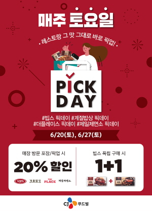 [이코노믹리뷰=전지현 기자] CJ푸드빌(대표 정성필)은 매주 토요일을 픽데이(PICK DAY)로 지정하고 빕스 등 외식브랜드 간편식과 포장 메뉴 구입 고객을 대상으로 풍성한 혜택을 제공한다고 16일 밝혔다.
